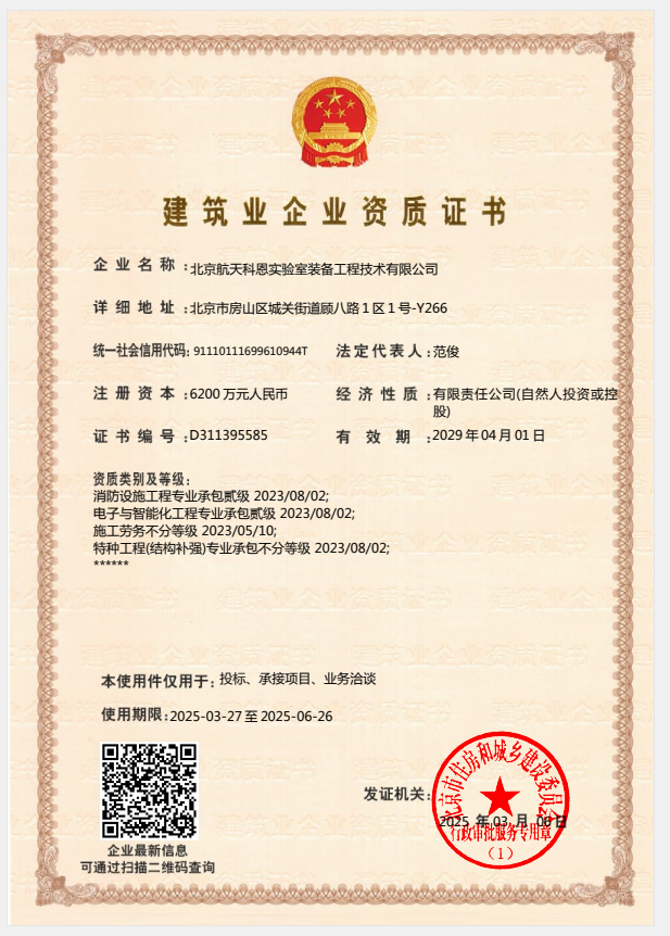 湖北航天科恩實(shí)驗(yàn)室裝備工程技術(shù)有限責(zé)任公司專注實(shí)驗(yàn)室建設(shè)EPC總承包,包括實(shí)驗(yàn)室規(guī)劃;實(shí)驗(yàn)室設(shè)計;實(shí)驗(yàn)室裝修;實(shí)驗(yàn)室改造;實(shí)驗(yàn)室施工;實(shí)驗(yàn)室暖通系統(tǒng);實(shí)驗(yàn)室廢氣廢液處理;實(shí)驗(yàn)室供氣、水電系統(tǒng);實(shí)驗(yàn)室家具生產(chǎn)定制安裝銷售;實(shí)驗(yàn)室相關(guān)配件供應(yīng)等。我們有20多年的實(shí)驗(yàn)室工程實(shí)施行業(yè)經(jīng)驗(yàn),合作客戶10000+,資質(zhì)齊全(實(shí)驗(yàn)室EPC總承包、建筑機(jī)電安裝工程專業(yè)承包叁級、環(huán)保工程專業(yè)承包叁級、建筑裝飾裝修工程專業(yè)承包貳級),售后完善,歡迎咨詢和考察。